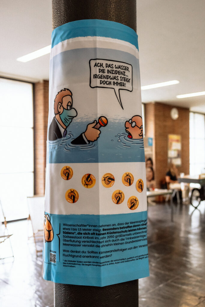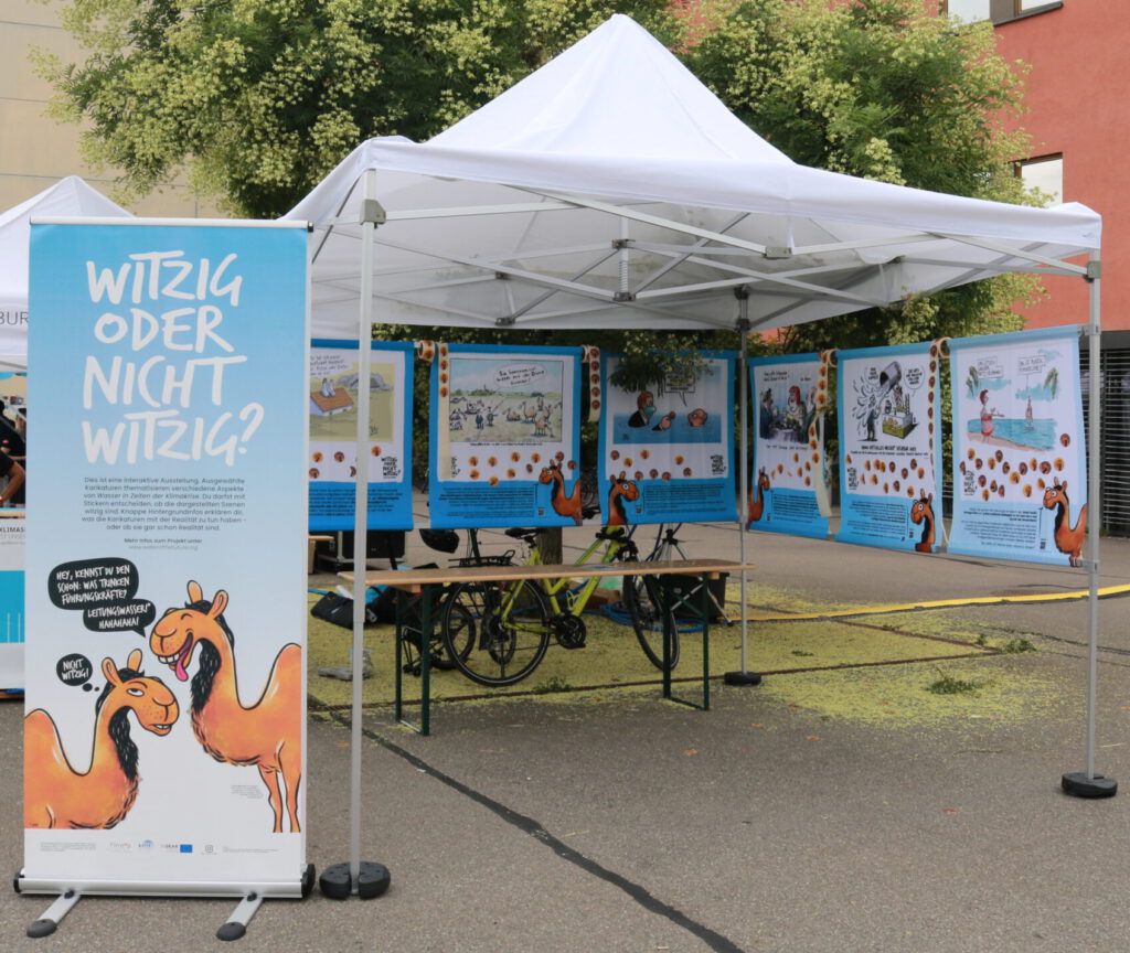 Die Ausstellung „Witzig, aber wahr!“ nähert sich auf humorvolle Weise dem Thema Wasser in Zeiten der Klimakrise. Sechs Ausstellungsbanner zeigen Karikaturen, die jeweils einen Aspekt des Wasserthemas in den Fokus rücken. Die Besucher*innen dürfen die einzelnen Karikaturen als „Witzig!“ oder „Nicht witzig!“ bewerten, indem sie einen entsprechenden Sticker aufkleben. Kurze Hintergrundinfos erklären, was die dargestellten Szenen mit der Realität zu tun haben.