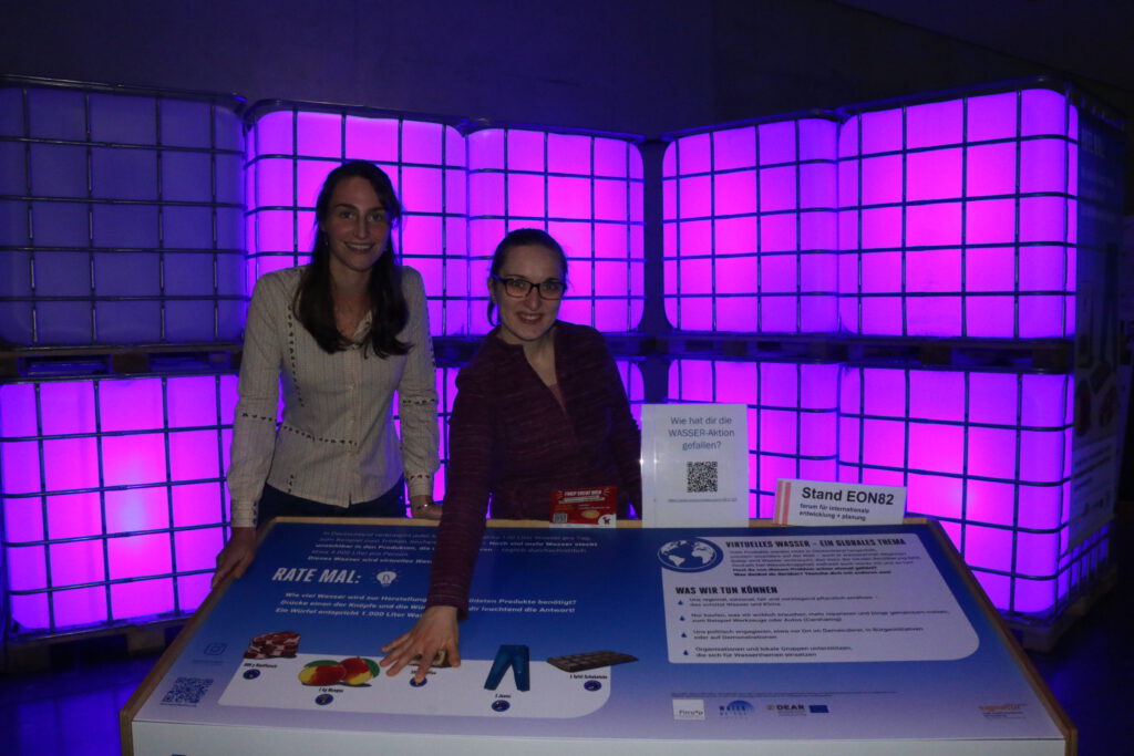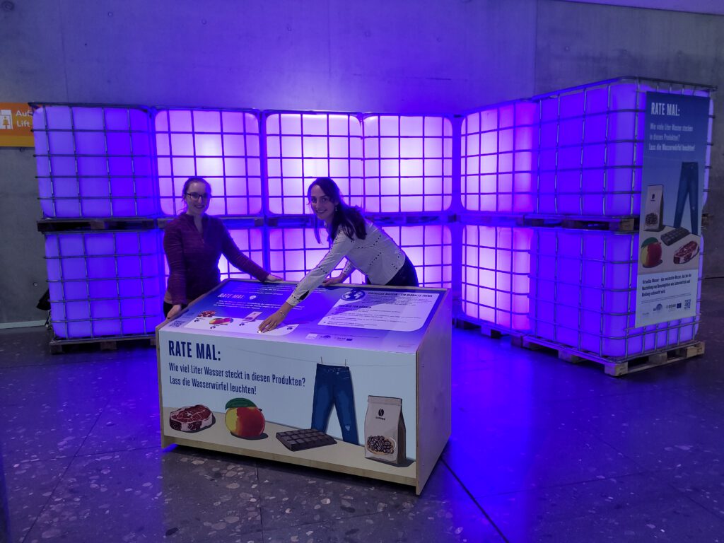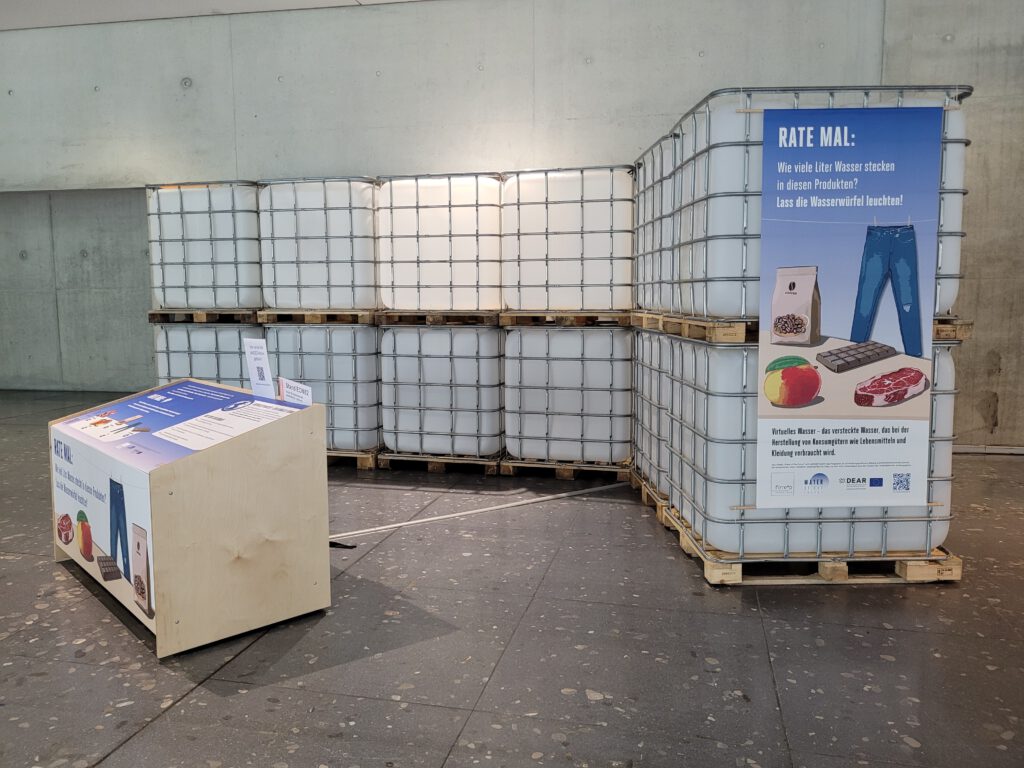 Die leuchtenden Tanks zeigen in blau die Menge an virtuellem Wasser an, die für die Produktion des jeweiligen Produkts verwendet wird. Da die Wassertanks groß sind und tatsächlich jeweils 1.000 Liter Wasser fassen könnten, macht die Installation die realen Wassermengen, die bei der Herstellung von Lebensmitteln und Alltagsprodukten verbraucht werden, anschaulich und für die Besucher*innen unmittelbar erfahrbar.