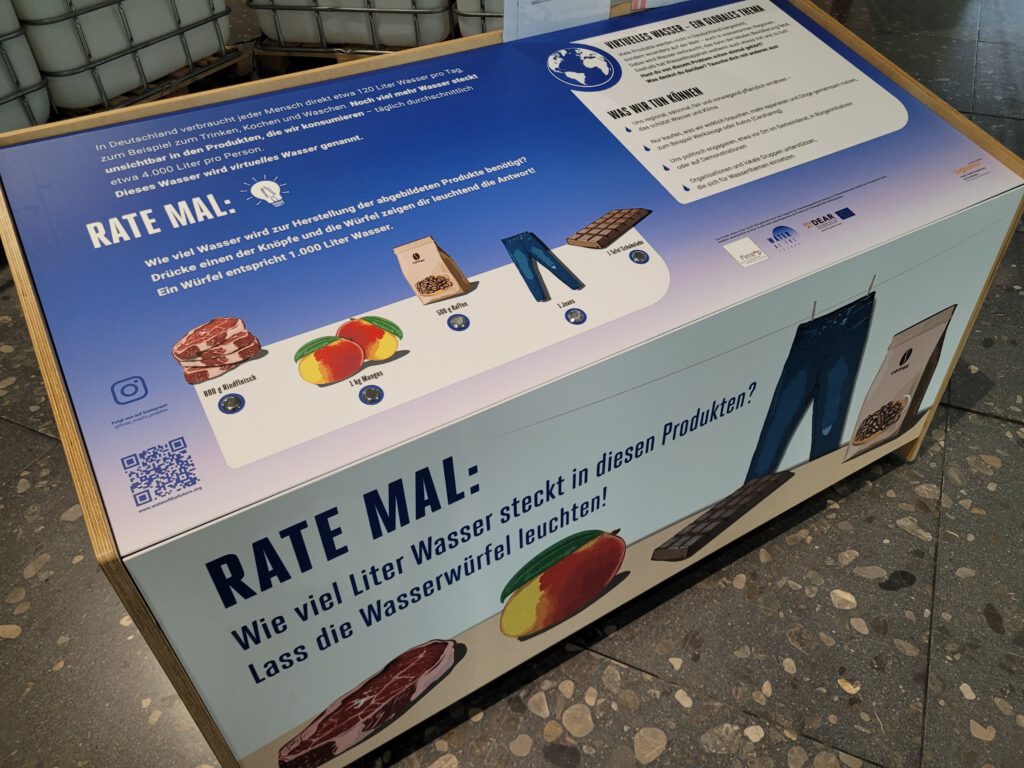 Wie viel Wasser steckt in Fleisch, Kaffee, Schokolade, Mangos oder Jeans? Die Lichtinstallation macht das Konzept des „virtuellen Wassers“ greifbar: Leere Wassertanks (je 1.000 Liter) leuchten blau auf – je nach Produkt und Menge. So werden Unterschiede sichtbar, etwa 12 Tanks für 1 kg Rindfleisch, aber nur 2 Tanks für Mangos. Über ein Schaltpult können Besucher*innen die Vergleiche selbst aktivieren und entdecken.
