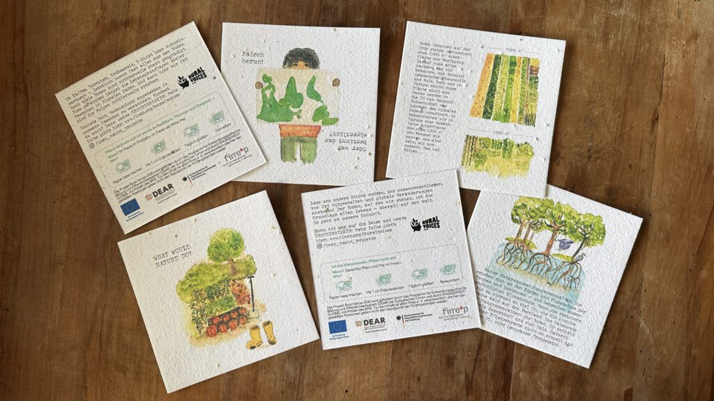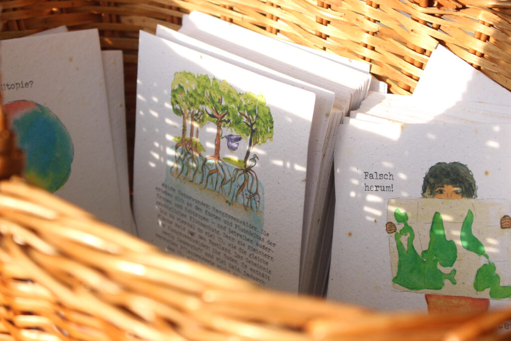 - Ideen- und Konzeptentwicklung: Entwicklung eines niedrigschwelligen, gut teilbaren Formats (Samenpapierkarten) zur Vermittlung globaler Zusammenhänge, das bewusst kein Wegwerfprodukt ist. Die Karten können eingepflanzt werden.