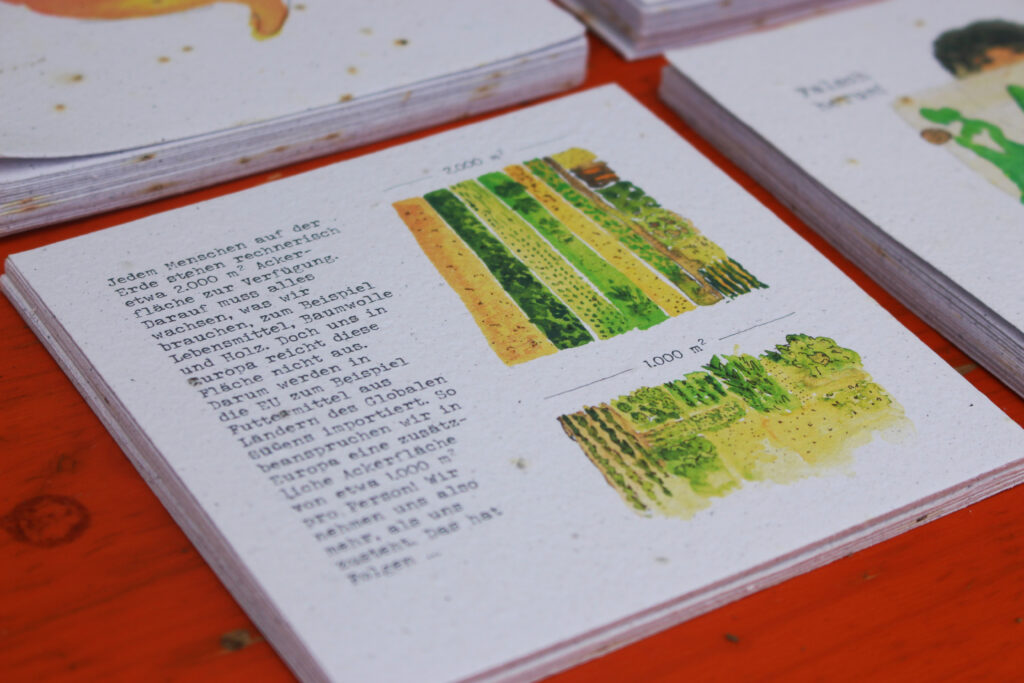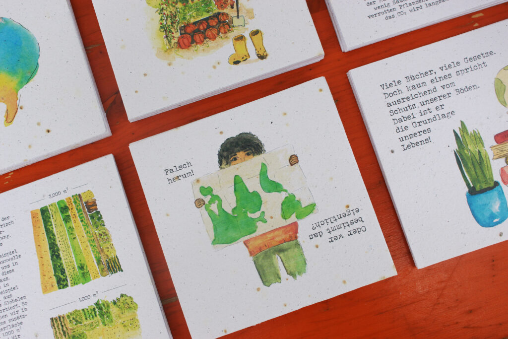 Die Samenpapierkarten verbinden ästhetisches Design mit inhaltlicher Tiefe und werden als hochwertiges Mitgabe- und Verteilmaterial gerne weitergegeben. Jede Karte zeigt auf der Vorderseite eine Illustration, auf der Rückseite vermittelt sie kompakte Informationen zu globalen Zusammenhängen und Herausforderungen zu Bodenschutz. Insgesamt gibt es sechs unterschiedliche Motive – von Bodenschutz und Flächennutzung über Mangroven, Permakultur und Weltbilder bis hin zur eigenen Utopie. Das Besondere: Die Karten bestehen aus Samenpapier und können eingepflanzt werden – Wissen wächst weiter.