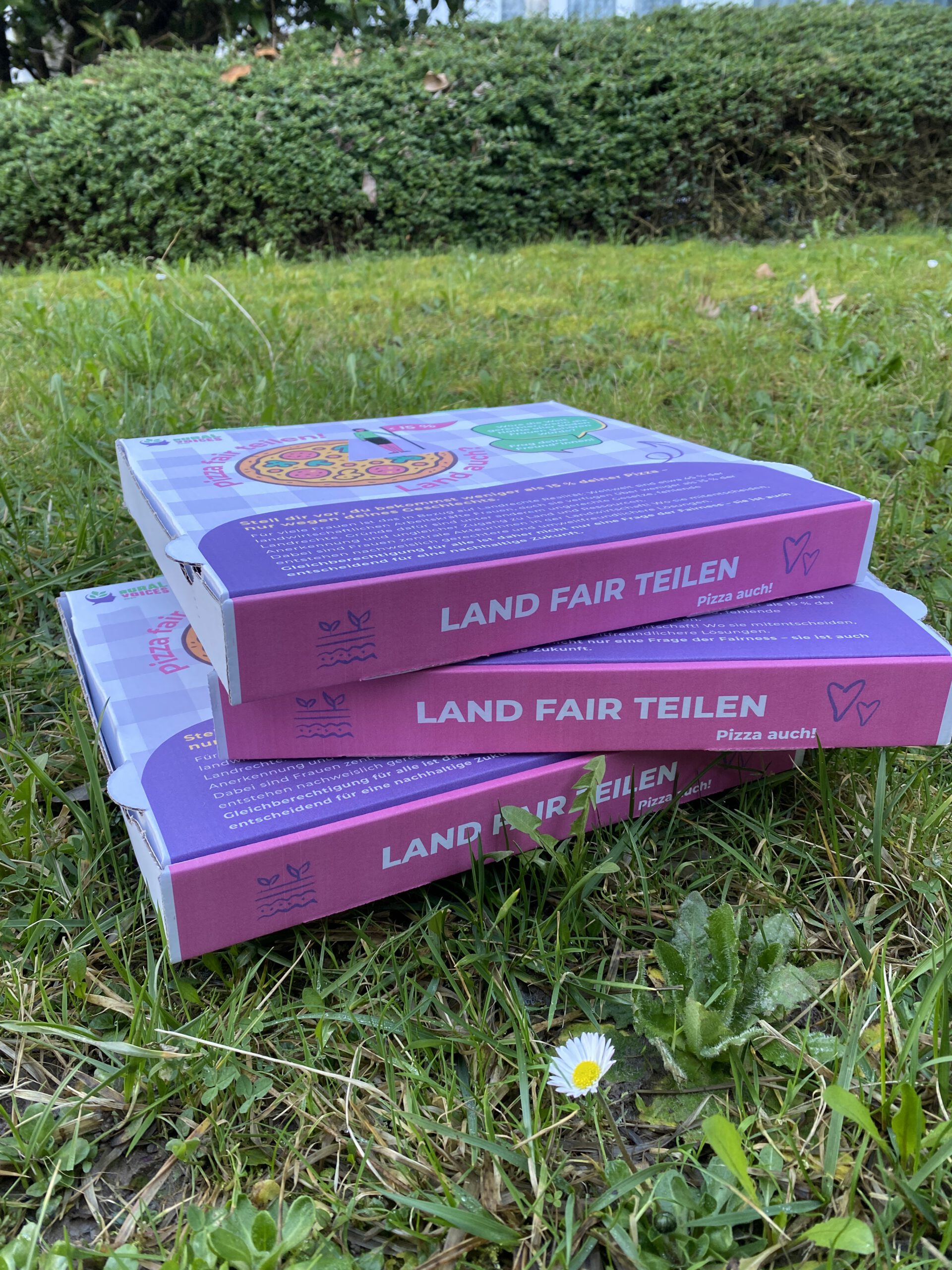 Pizzakarton „Pizza fair teilen! Land auch?“: