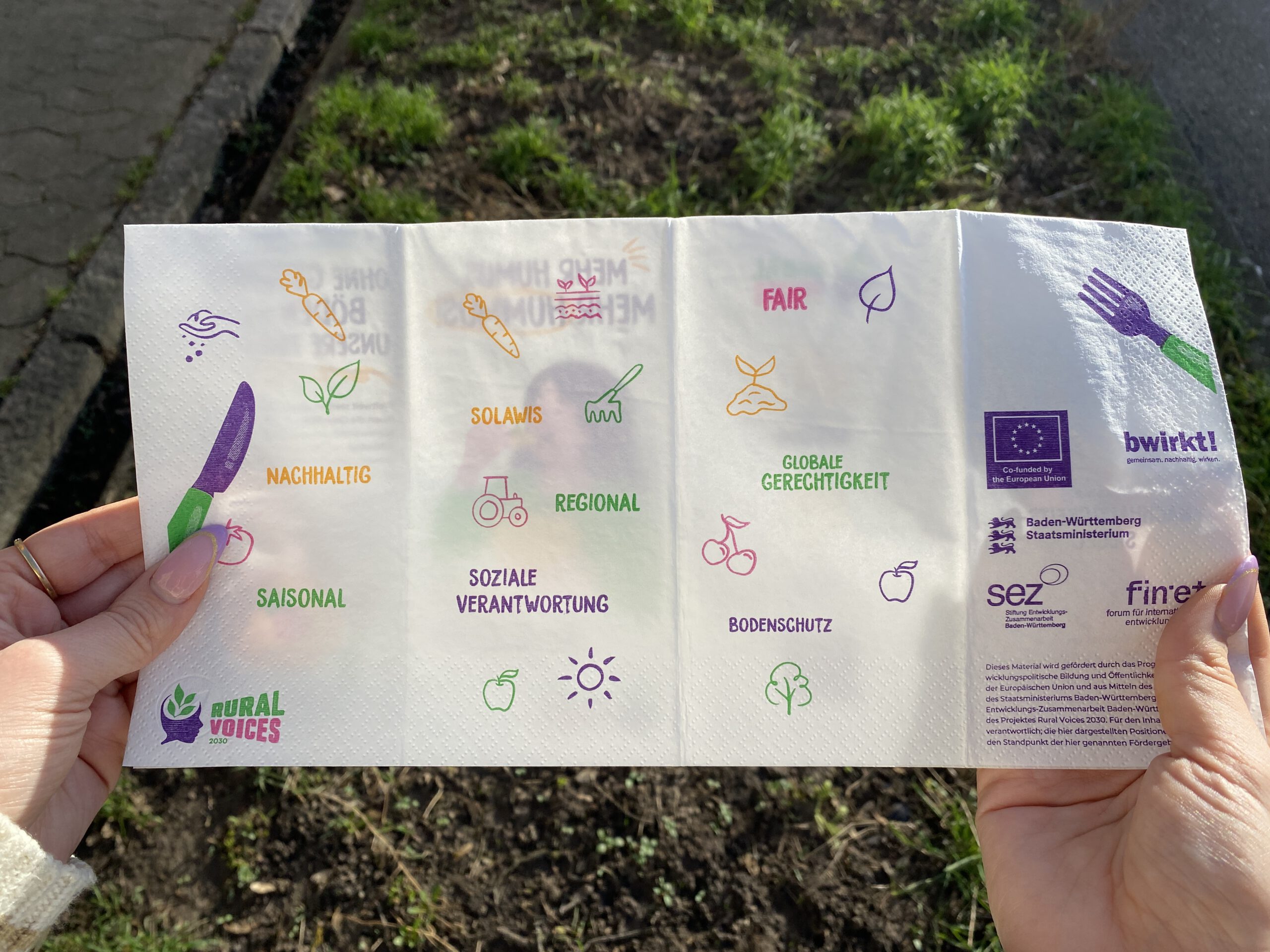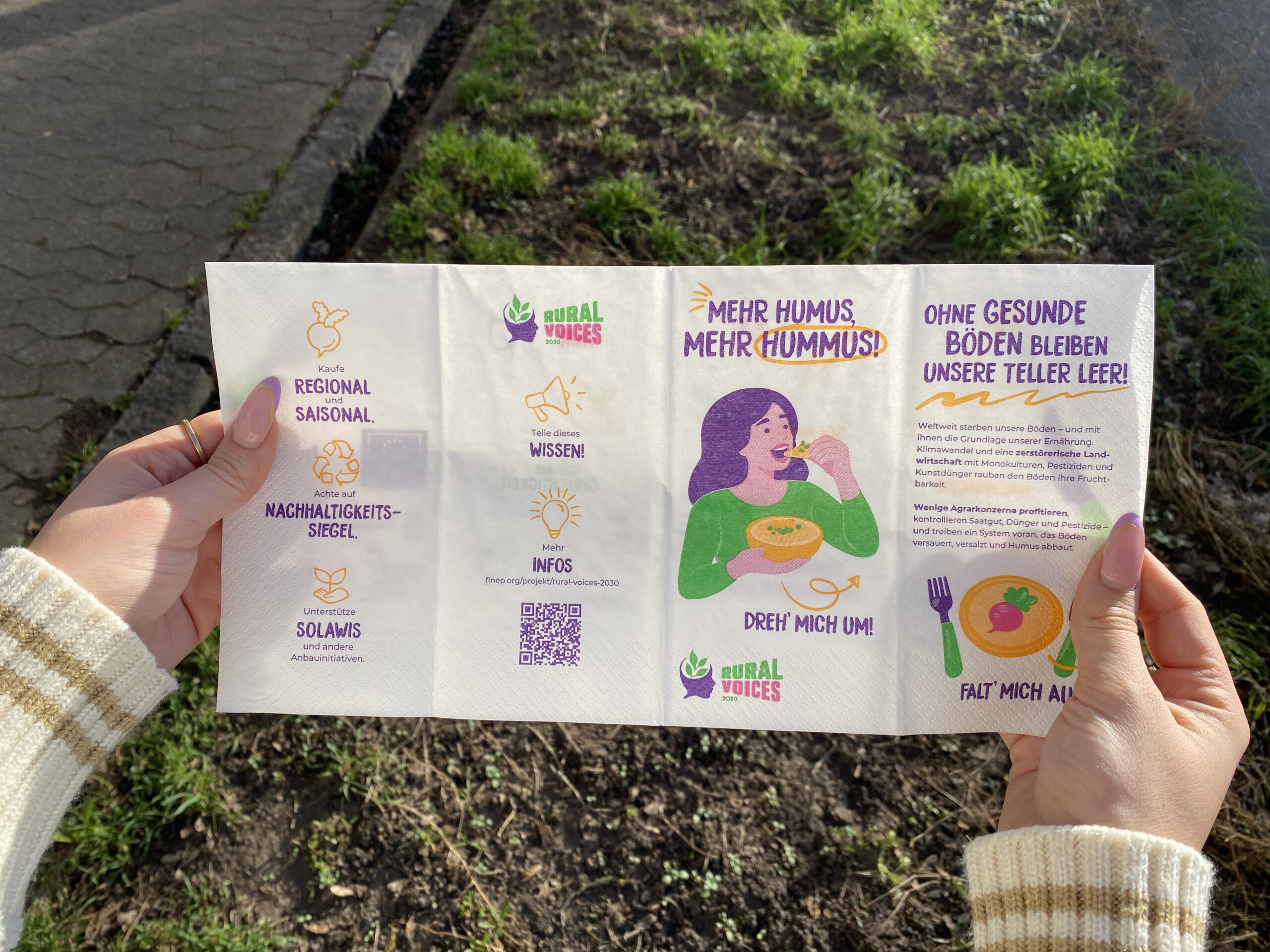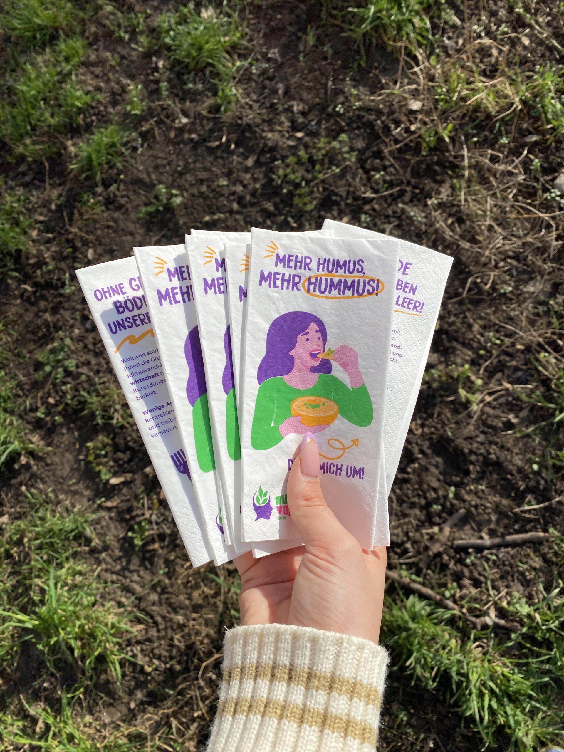 - Servietten eignen sich besonders gut, wenn die Botschaft an die Handlung gekoppelt ist (Essen → Boden → Landwirtschaft → Konsumentscheidung).