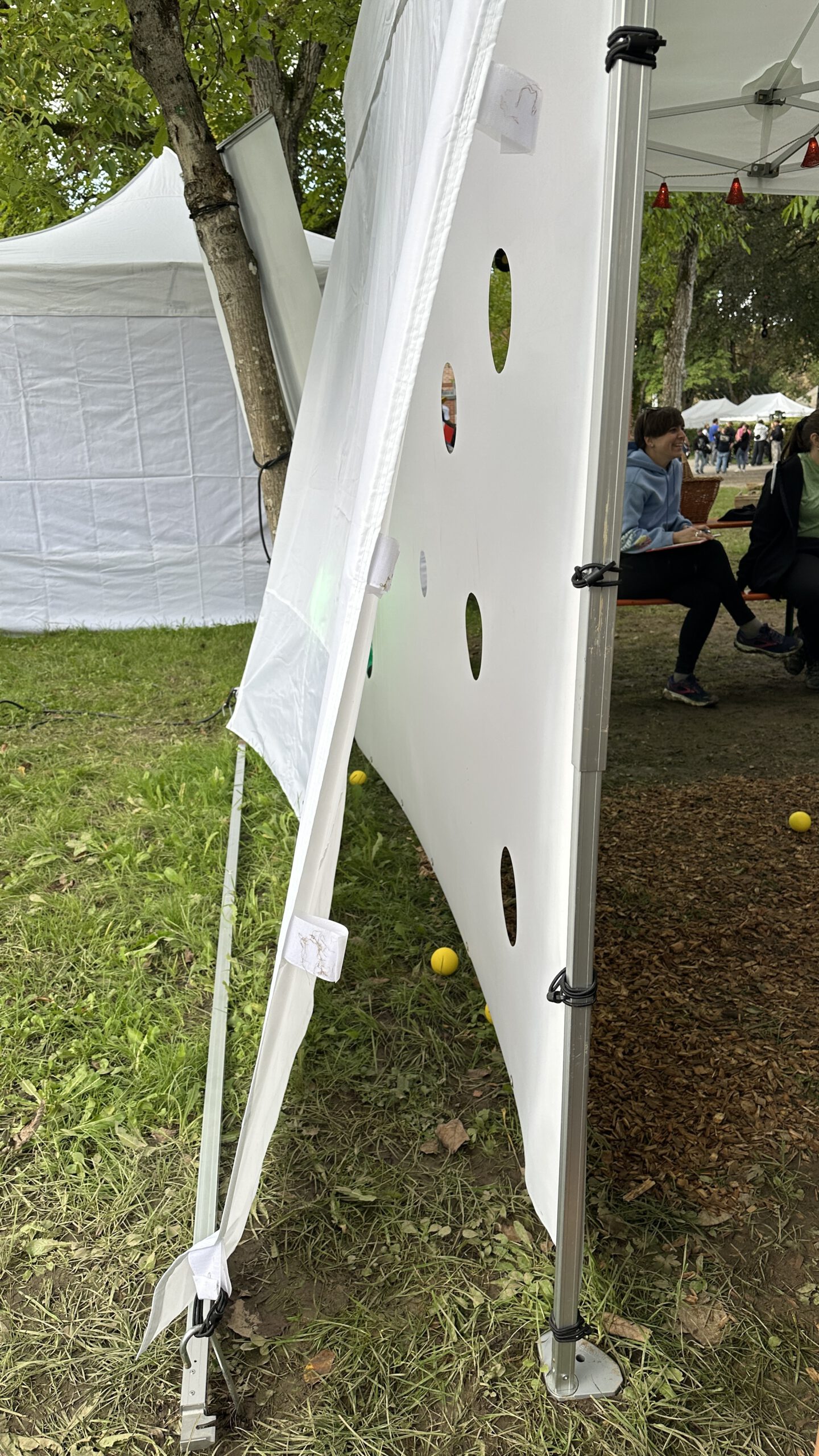 Die Wurfwand kann an einer Seite eines stabilen Pavillons aufgespannt werden – dieser kann mitverliehen werden, muss allerding in Esslingen vor Ort abgeholt werden. Alternativ kann ein eigener Pavillon (mind. 3 m Breite und 2 m Höhe) oder eine anderweitige Vorrichtung genutzt werden.